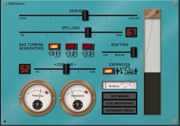 Matt Round’s DataCenter.FM hands you the controls of a simulated server farm. Move sliders, flick switches, push servers, cooling, gas turbines and construction crews from a gentle whir to a screaming cacophony with flashing warning lights. Eight audio loops and 27 alarms do the heavy lifting.